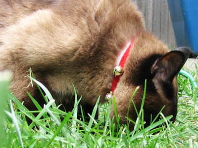 "Yes! Here is some nice smelly grass for me to nibble on....yummy! Smells great, tastes great! Of course I will upchuck it later and the grandma will squeal and Mom will have to clean it up, but you know.... that is at least half the fun!"
